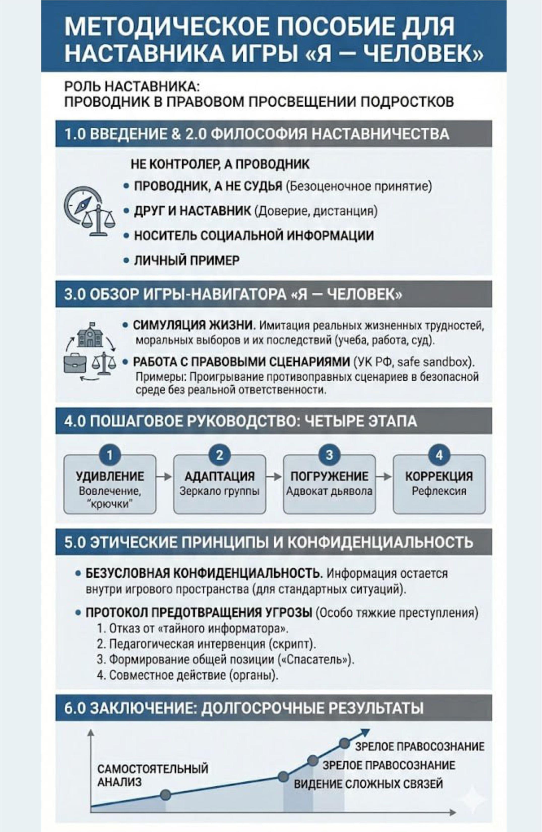 Основная цель данного руководства — предоставить наставникам (модераторам) четкие методические инструкции и философские ориентиры для эффективного проведения игры. В этом документе мы раскроем не только механику игрового процесса, но и ключевые принципы, которые позволят модератору стать для подростка настоящим проводником в мире социальных и правовых норм.